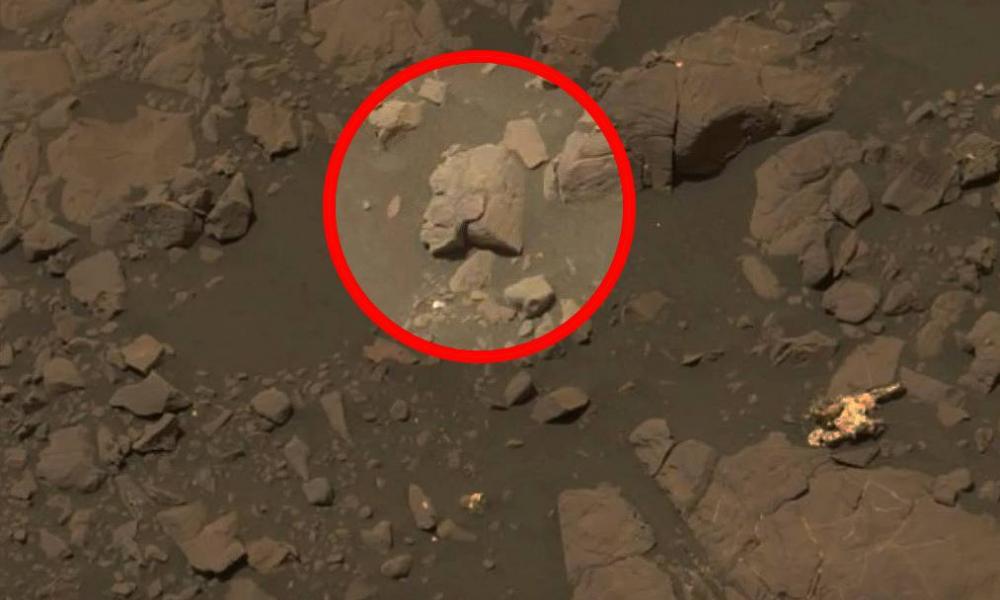 Σύμφωνα με τον ουφολόγο, μια από τις πέτρες στον Κόκκινο πλανήτη – ο Γουόρινγκ την εντόπισε εξετάζοντας φωτογραφίες της NASA , κάτι που αρέσκονται να κάνουν διαρκώς οι ουφολόγοι - μοιάζει με ένα αντρικό κεφάλι που φορά κράνος.
