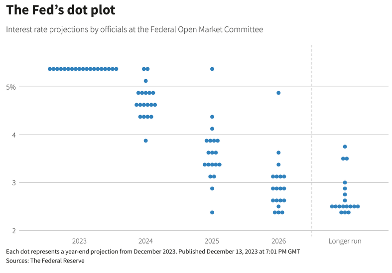 Σύμφωνα με τa στοιχεία της Fed, τρεις πιθανές μειώσεις ήταν η πιο δημοφιλής πρόβλεψηη των μελών της FOMC (της Επιτροπής Ανοικτών Αγορών της κεντρικής τράπεζας) για στο επόμενο έτος, με άλλα πέντε μέλη να αναμένουν ακόμη πιο επιθετική χαλάρωση της νομισματικής πολιτικής.