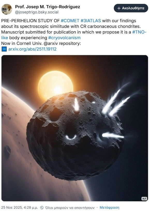 βάση arXivΤα ευρήματα της μελέτης υποδηλώνουν ότι ο κομήτης 3I/ATLAS μοιάζει εντυπωσιακά με τα παγωμένα ουράνια αντικείμενα πέρα από τον Ποσειδώνα, τα αποκαλούμενα μεταποσειδώνια ή υπερποσειδώνια – νάνοι πλανήτες και άλλα ουράνια σώματα που βρίσκονται πέρα από τον τελευταίο πλανήτη του Ηλιακού Συστήματος. Εάν αυτό επιβεβαιωθεί, σημαίνει ότι παρά το γεγονός ότι προέρχεται από άλλο ηλιακό σύστημα, ο κομήτης 3I/ATLAS έχει εκπληκτικά πολλά κοινά με αντικείμενα στη δική μας κοσμική γειτονιά.