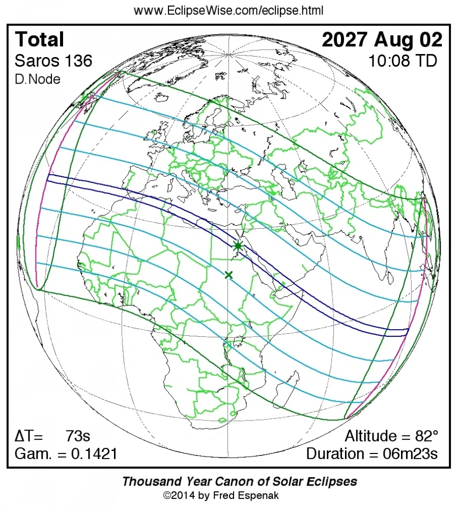 2 Αυγούστου 2027 θα λάβει χώρα μια ολική ηλιακή έκλειψη με ασυνήθιστη διάρκεια. Η ολική φάση θα διαρκέσει πάνω από έξι λεπτά, μια διάρκεια που την καθιστά την μακρύτερη έκλειψη του 21ου αιώνα και ένα από τα μακρύτερα αστρονομικά γεγονότα που έχουν καταγραφεί στη σύγχρονη εποχή.Οι αστρονομικοί υπολογισμοί δείχνουν ότι αυτό το φαινόμενο είναι σπάνιο. Η διαστημική υπηρεσία εξήγησε ότι η προβλεπόμενη διάρκεια δεν θα επαναληφθεί για αρκετές δεκαετίες και ότι ξεπεράστηκε μόνο από την ολική έκλειψη που συνέβη το 1991.