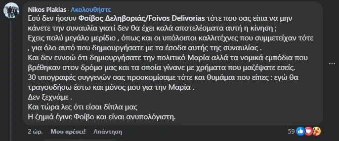 εμφατικά τις αποστάσεις από κείνην και το υπό δημιουργίαν κόμμα της. Μαζί τους 100%. Τα ανθρώπινα δικαιώματα δεν μπαίνουν σε διαβούλευση».Ακολούθησαν εκατοντάδες σχόλια κάτω από την ανάρτησή του Φοίβου Δεληβοριά μεταξύ των οποίων και του Νίκου Πλακιά ο οποίος έγραψε: «Εσύ δεν ήσουν Φοίβος Δεληβοριάς/Foivos Delivorias τότε που σας είπα να μην κάνετε την συναυλία γιατί δεν θα έχει καλά αποτελέσματα αυτή η κίνηση ;