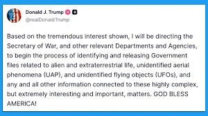 Σύμφωνα με πρόσφατη ανάρτησή του στο Truth Social, ο Ντόναλντ Τραμπ έχει ήδη δώσει εντολή στον Υπουργό Πολέμου, Πιτ Χέγκσεθ, και στις αρμόδιες υπηρεσίες να ξεκινήσουν τον εντοπισμό και τη δημοσιοποίηση όλων των αρχείων που αφορούν τα UFO. Μέχρις στιγμής πάντως η κυβέρνηση κρατά κλειστά τα χαρτιά της για το ακριβές περιεχόμενο και τον χρόνο των αποκαλύψεων. Ο Χέγκσεθ επιβεβαίωσε ότι η έρευνα στα αρχεία βρίσκεται σε εξέλιξη, δηλώνοντας χαρακτηριστικά πως θα κάνει την ανασκόπηση και θα μάθει τα αποτελέσματα μαζί με το κοινό.