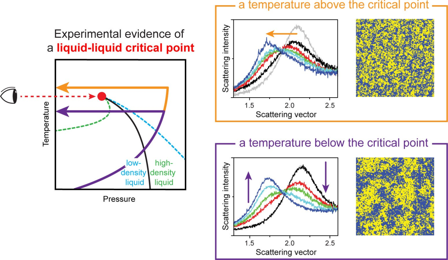 Σχηματική απεικόνιση των πειραματικών αποδείξεων για την ύπαρξη ενός κρίσιμου σημείου υγρού-υγρού, το οποίο παρατηρήθηκε με τη χρήση ενός λέιζερ ελευθέρων ηλεκτρονίων ακτίνων Χ (XFEL). Πηγή: POSTECH