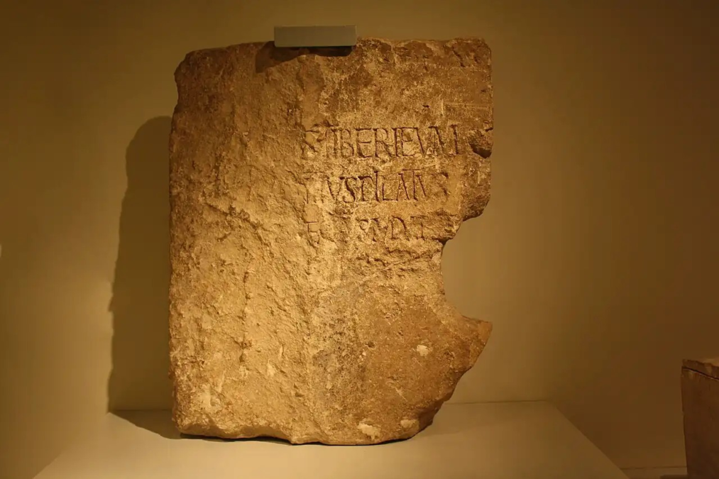 [Caesariens(ibu)]s Tiberieum [Pon]tius Pilatus [praef]ectus Iuda[ea]e [d]e[d]it (Ο Πόντιος Πιλάτος, έπαρχος της Ιουδαίας, αφιέρωσε το Τιβεριέουμ στους κατοίκους της Καισάρειας).