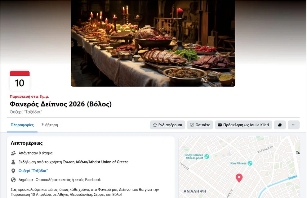 Η Ένωση Αθέων απευθύνει πρόσκληση τη Μεγάλη Παρασκευή 10 Απριλίου σε ένα Φανερό, όπως το αποκαλεί, Δείπνο, σε Αθήνα, Θεσσαλονίκη, Σέρρες και Βόλο.